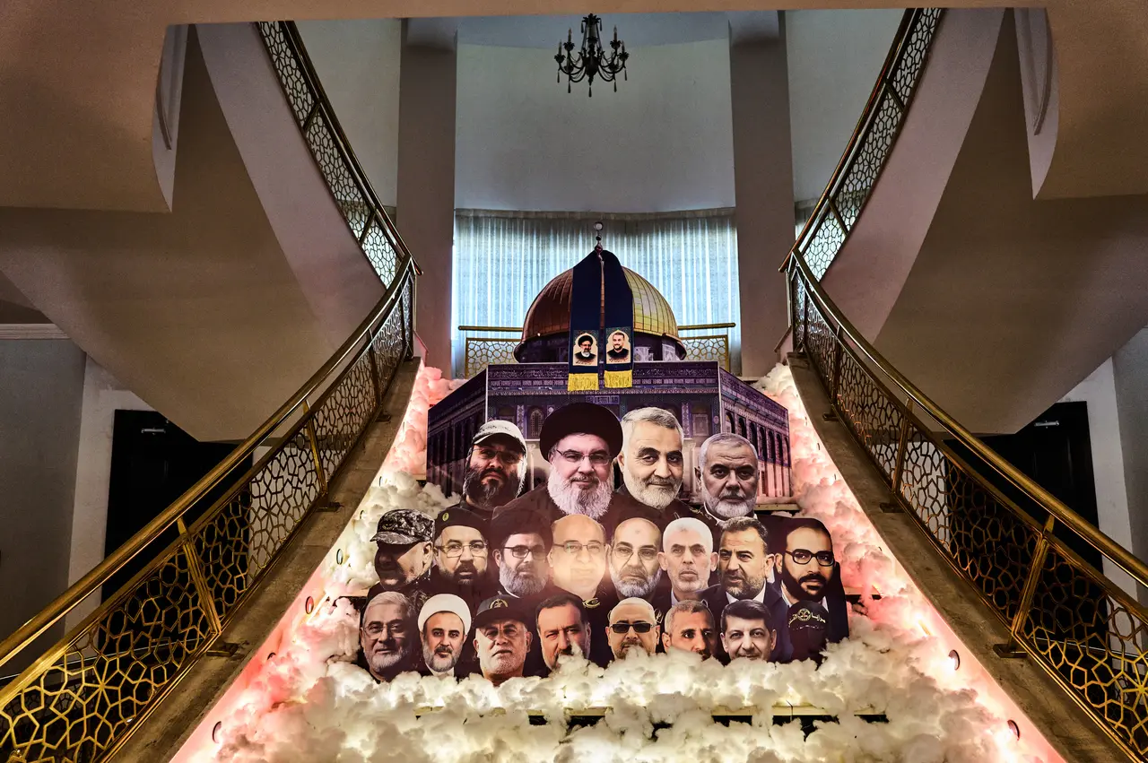 Portraits of martyred figures from Iran’s so-called Axis of Resistance were displayed as cut-out images along the main staircase inside the Iranian embassy. Set against the Al-Aqsa Mosque and ringed by fake flowers, it felt staged, ceremonial, and deeply absurd.