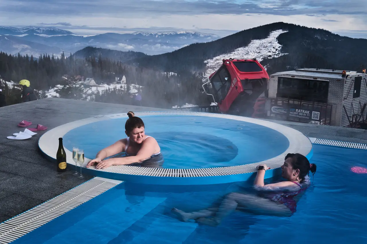 In the west we saw a side of Ukraine that is rarely talked about. We were in Drahobrat, where two women sat in a heated outdoor pool with champagne. It is said to be the highest pool in the country. Soldiers and families come here to escape the constant pressure of war.