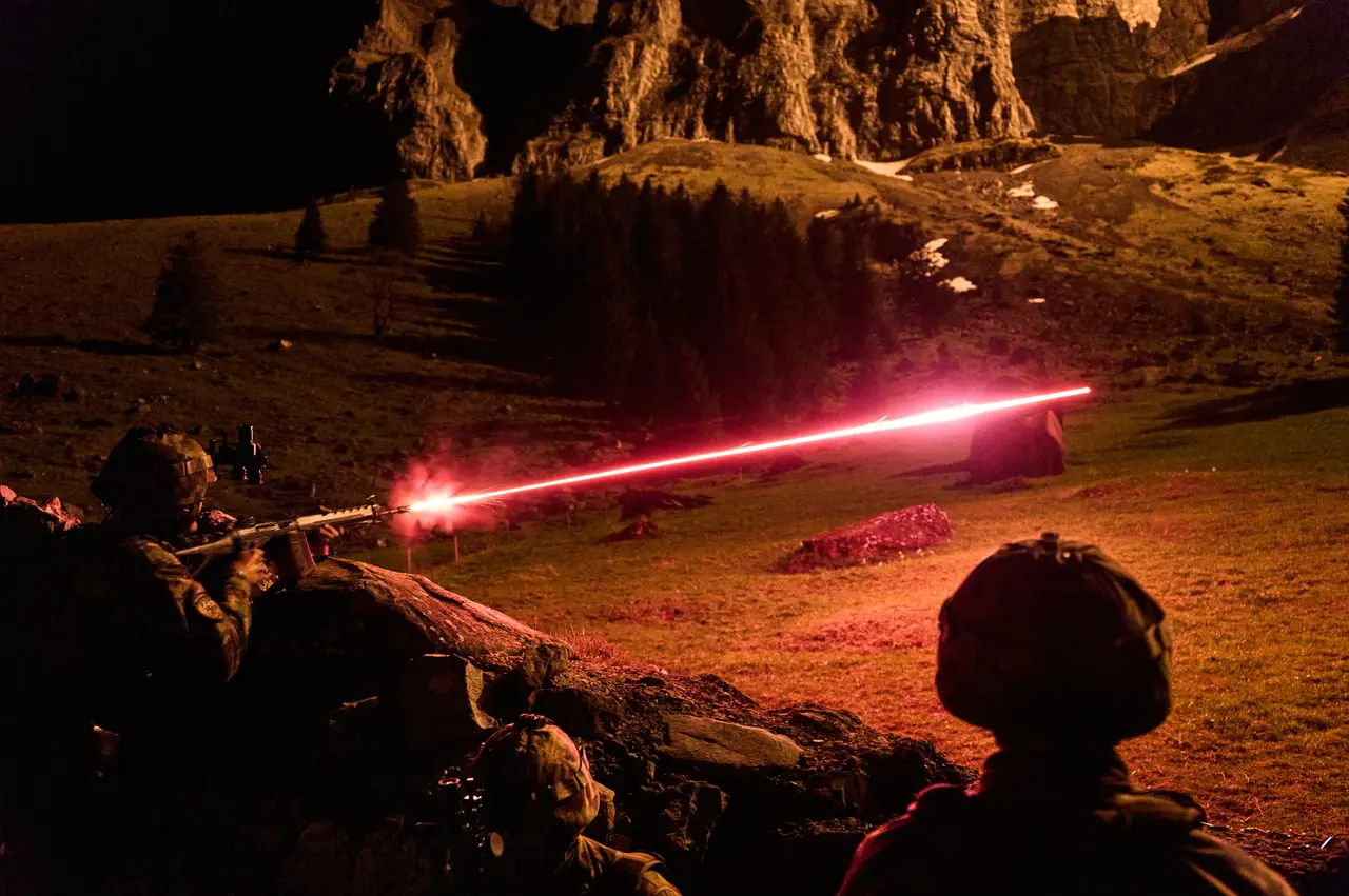 Here Swiss Army soldier fires tracer ammunition from cover at night. Soldiers of Mountain Infantry Battalion 6 during a training exercise on the Schwägalp near the Säntis mountain (known in our family as our family mountain).