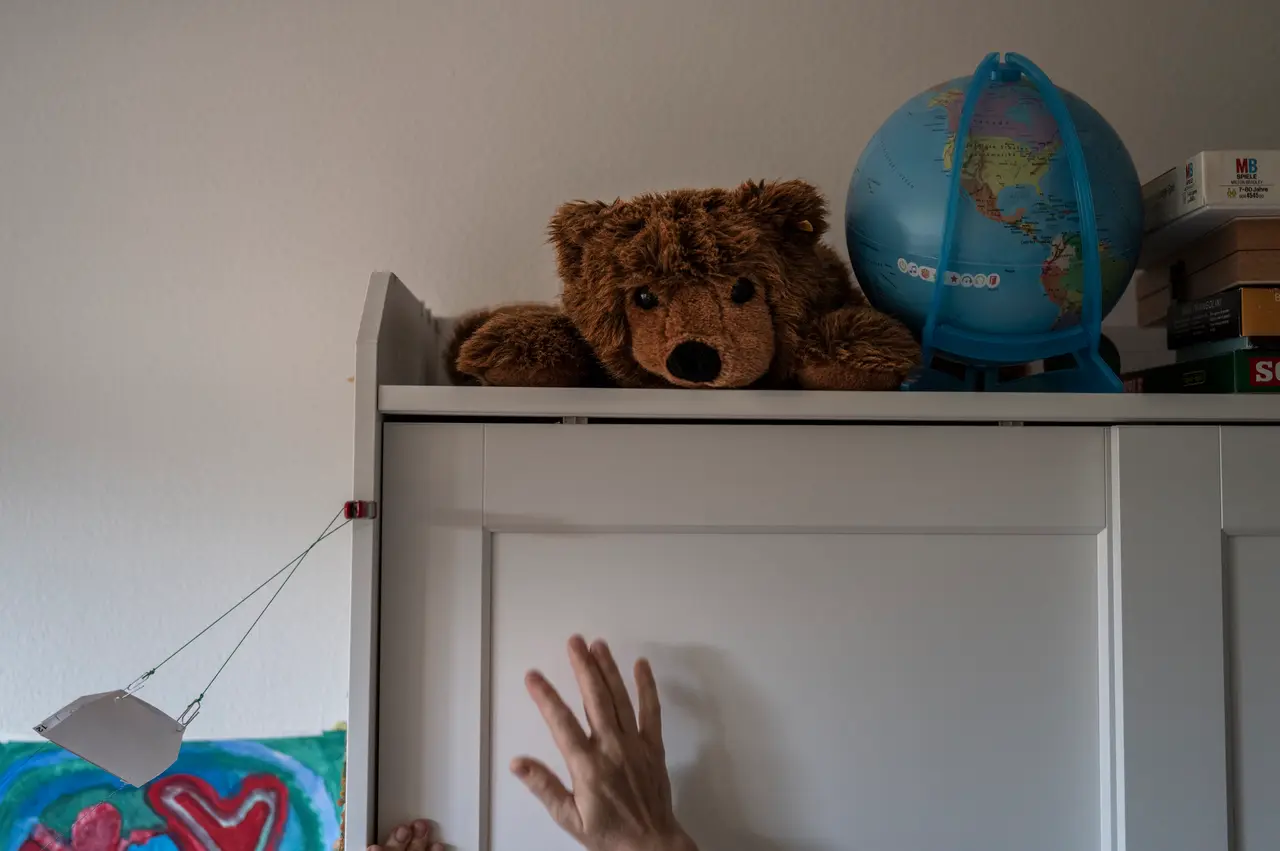 She told me about a small stuffed toy that still belonged to him. She reached up to the top of the closet to take it down. I photographed her hands stretching toward it. For me, that gesture held the memory of her son.